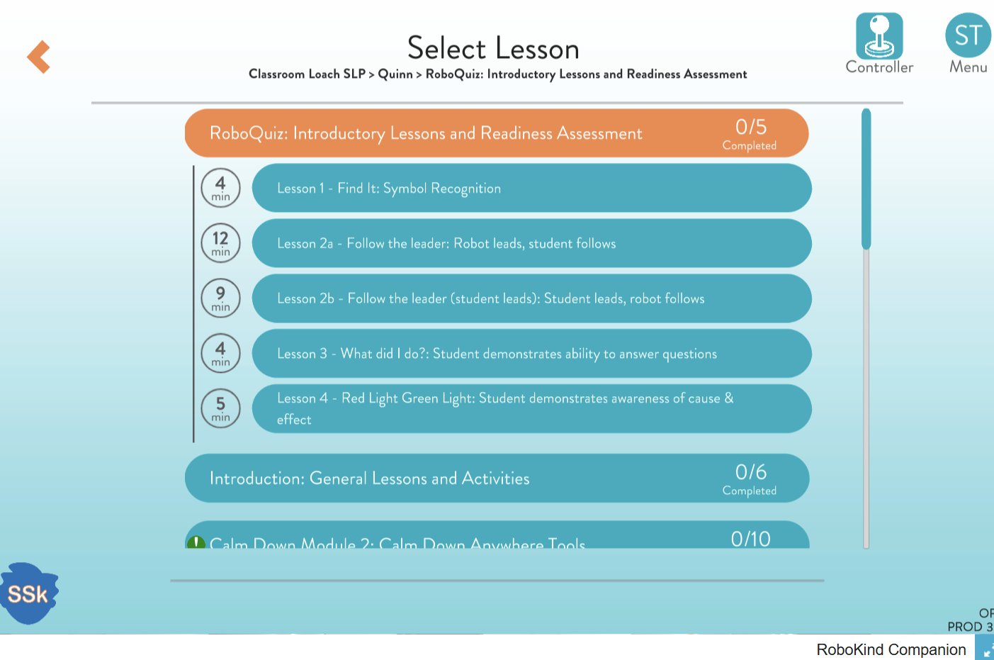 Upon logging into the Companion App, select your robot/virtual, classroom, and student(s). Navigate to and click All Modules. The RoboQuiz is the first module available in the lesson selection page.