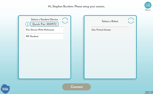 - On the Facilitator Device, select the student device nickname and your robot OR virtual avatar. Hit “Connect”.