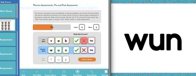 Both assessments utilize a quick check-up called the "Letter Naming Sprint" and "Silly Word Sprint". Every time an assessment is taken, different random letters and words are presented to the student.