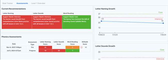 - When you click "Assessments" you'll be navigated to the report detailing how a student performed in the various assessments along with recommended support to aid their phonics journey.